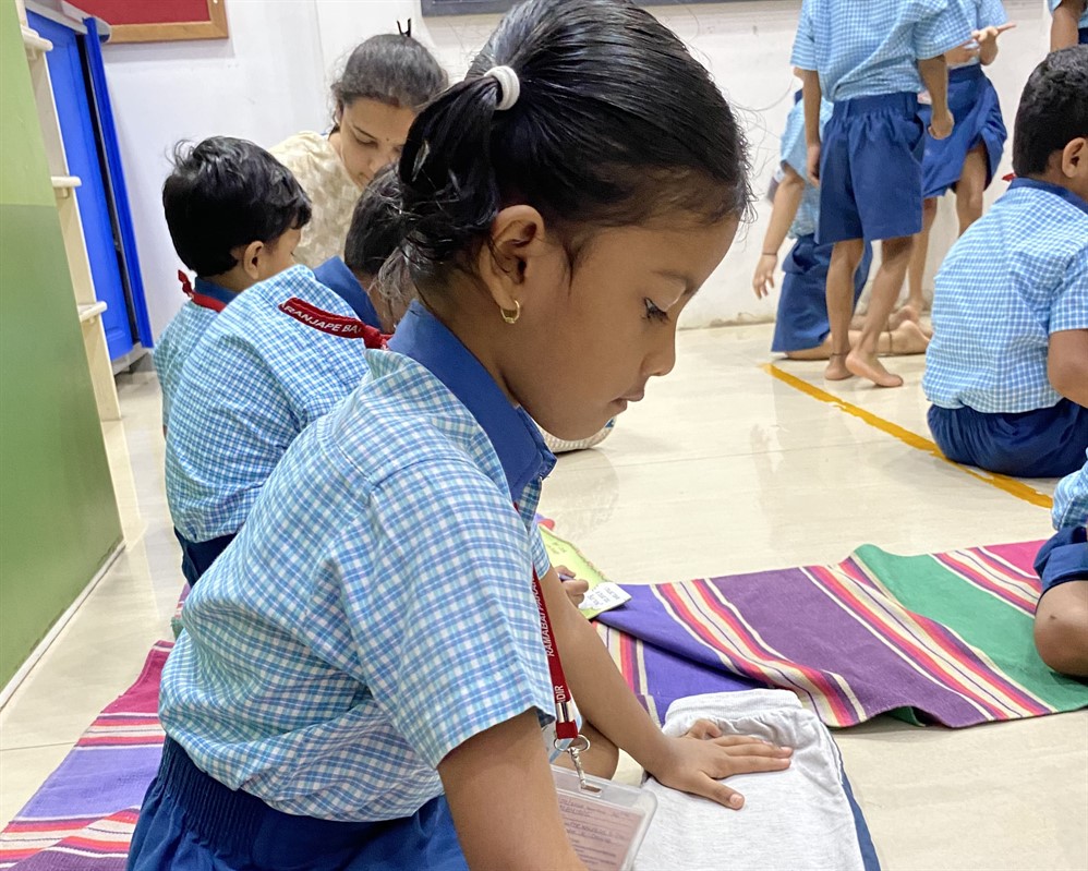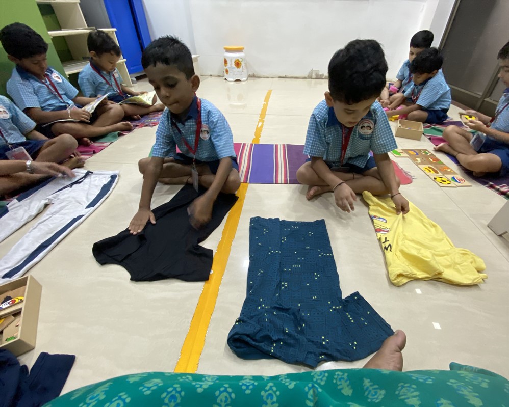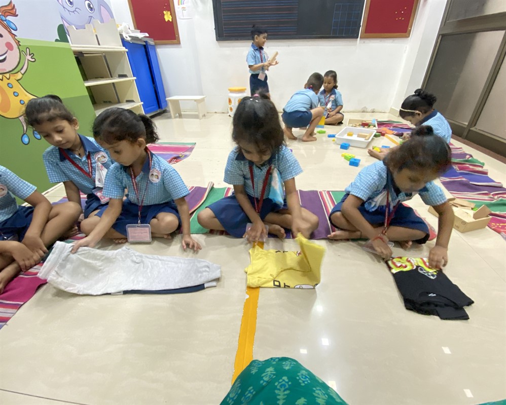Children practiced independence and responsibility through a fun clothes-folding activity.
