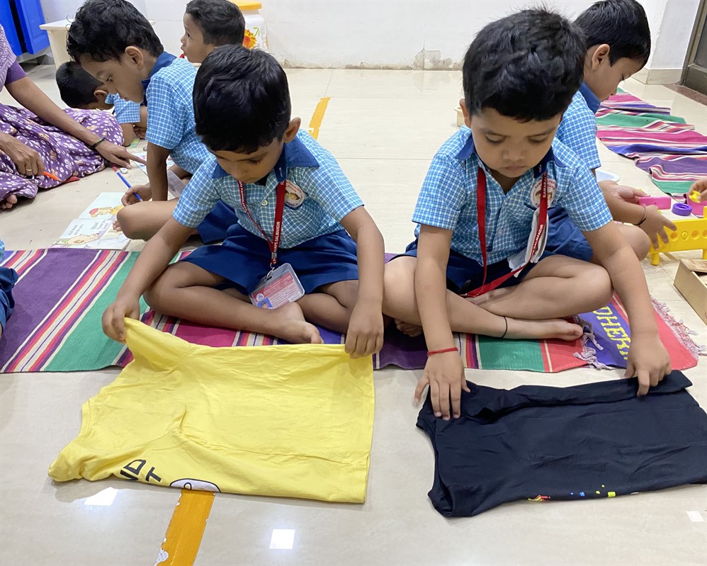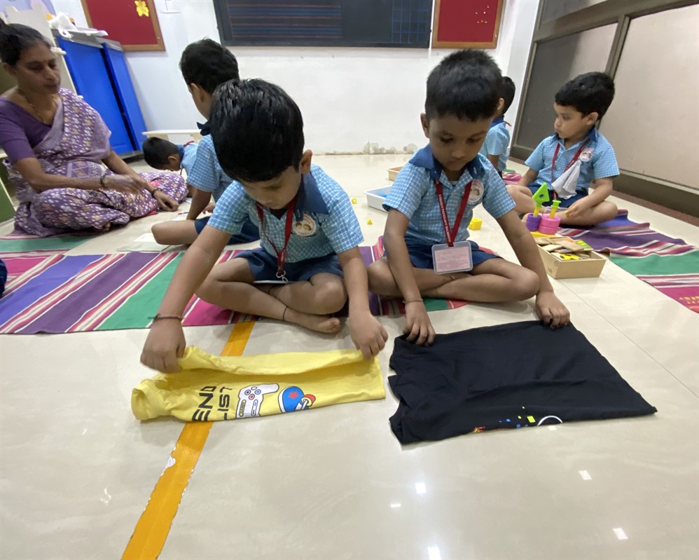 Children practiced independence and responsibility through a fun clothes-folding activity.