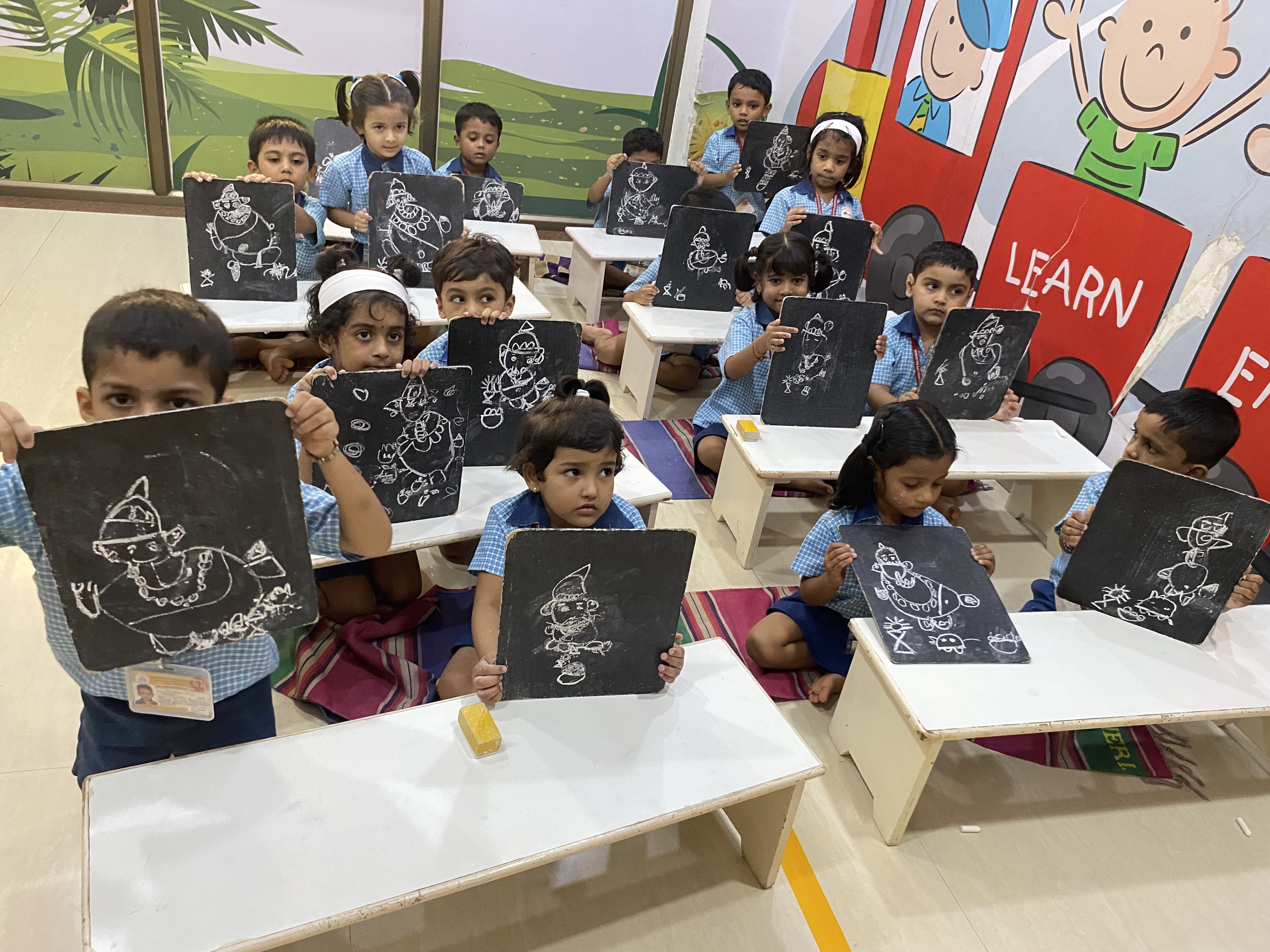 Kids express their devotion through vibrant Ganapati-themed artwork.