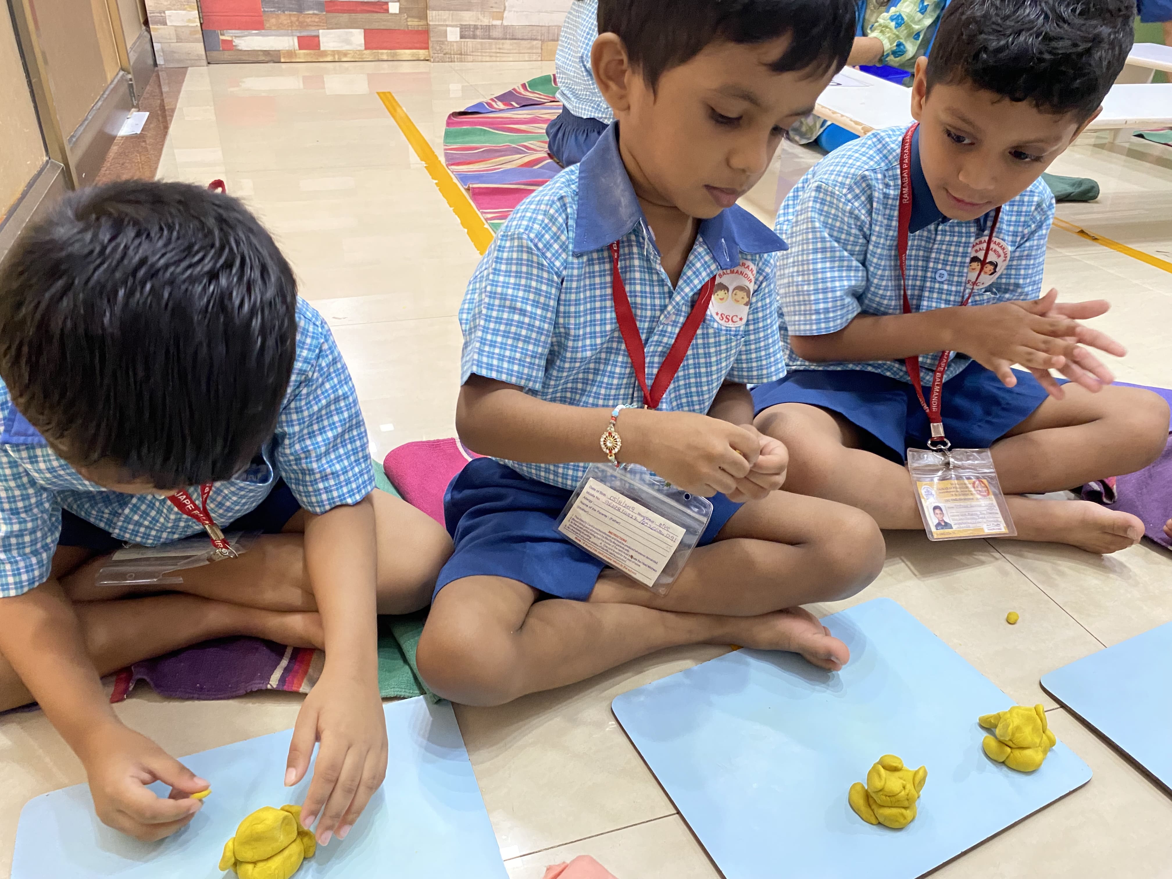 Young artists craft eco-friendly Ganapati idols with enthusiasm.