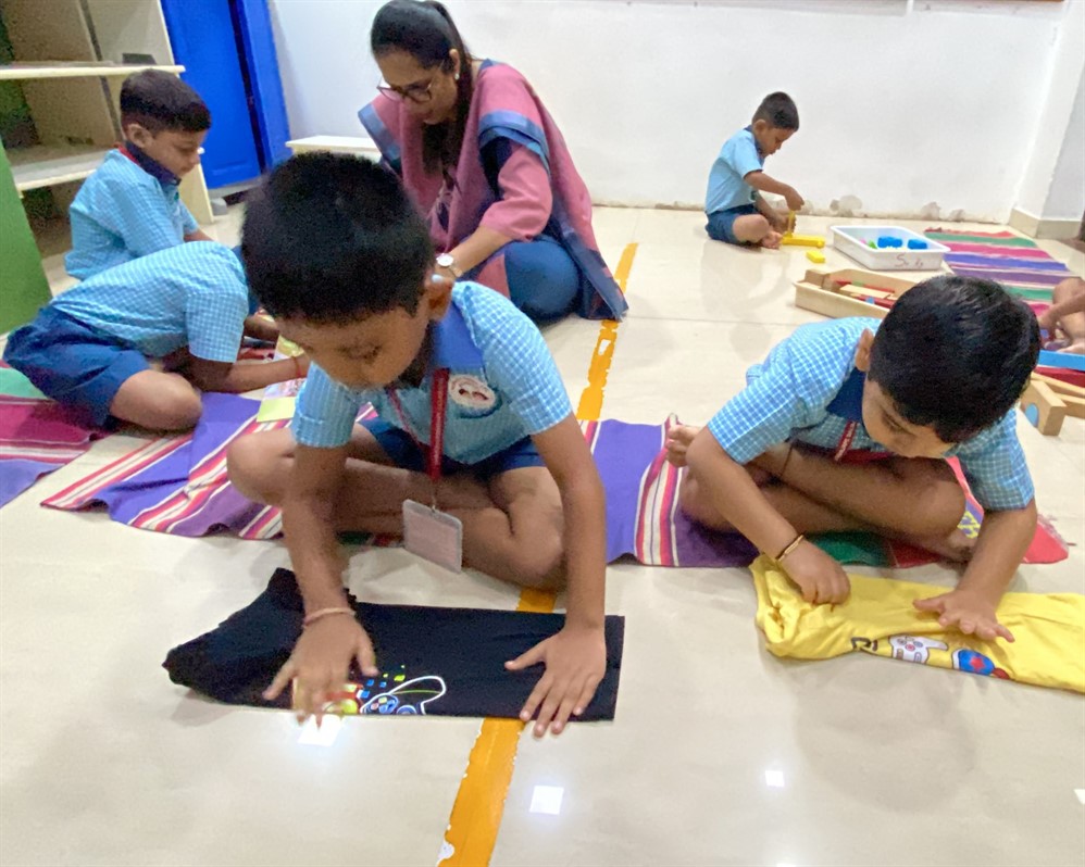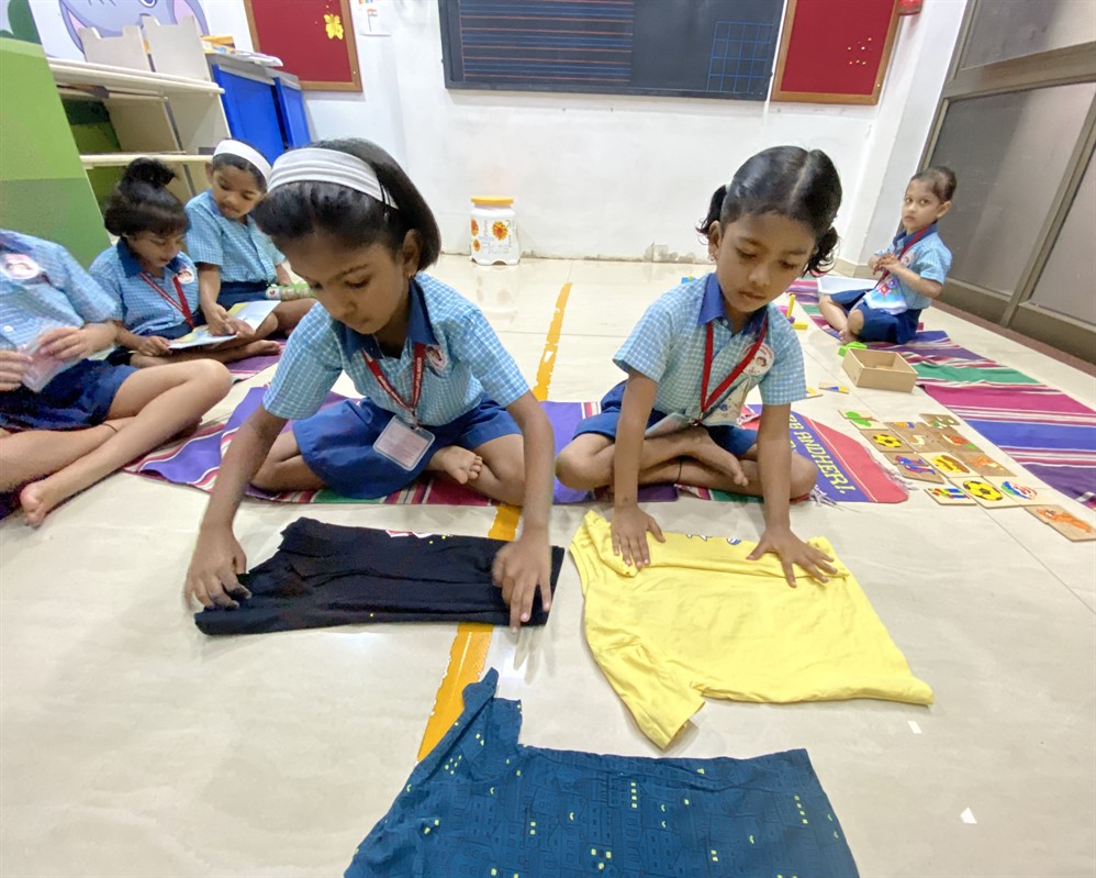 Children practiced independence and responsibility through a fun clothes-folding activity.