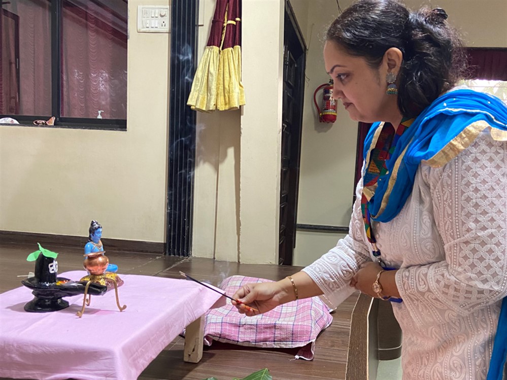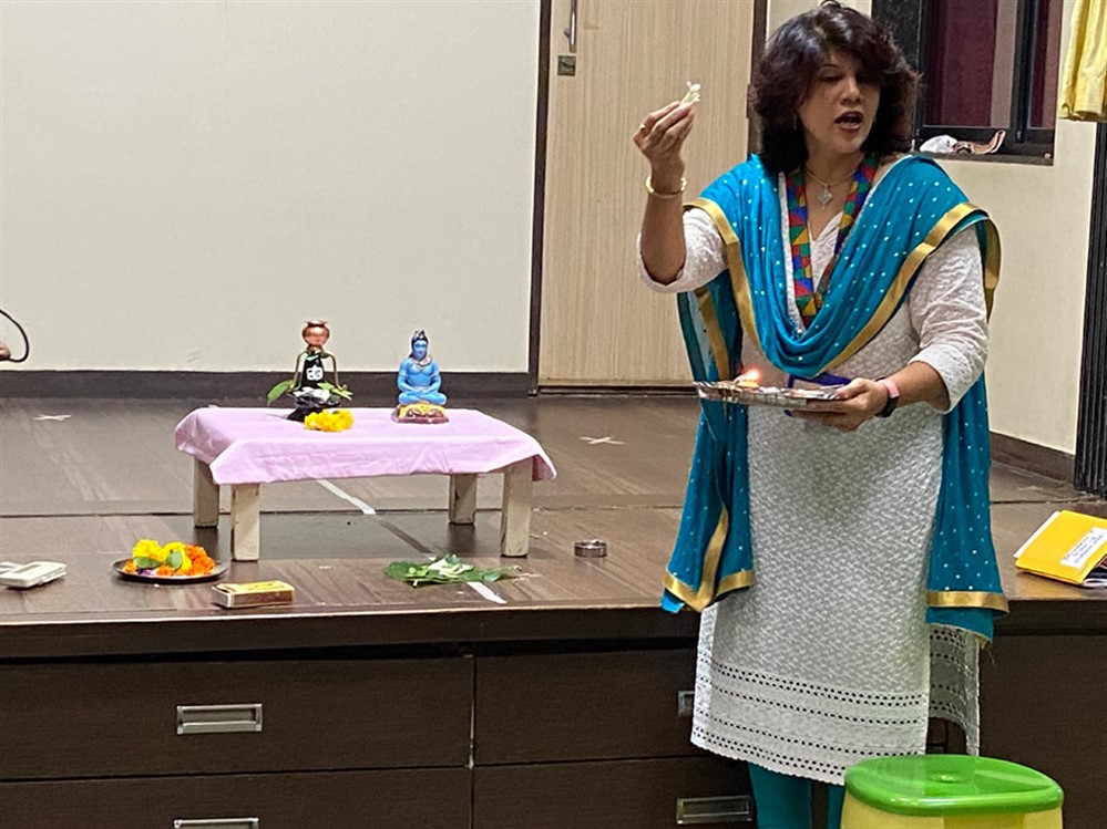 We honour lord Shiva in the class room by placing his idol and offering white flowers and bel patra. We also place Shivlinga and shower milk and water through abhishek patra ( utensil with a small hole at the bottom). As lord Shiva likes white colour all teachers wear white dress on this day.