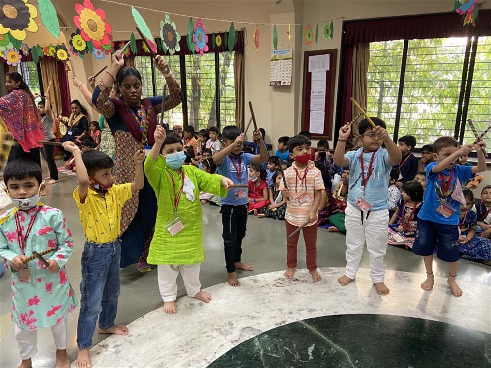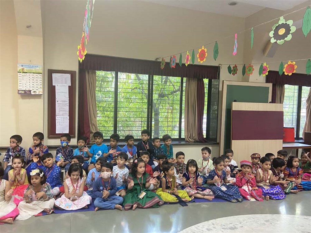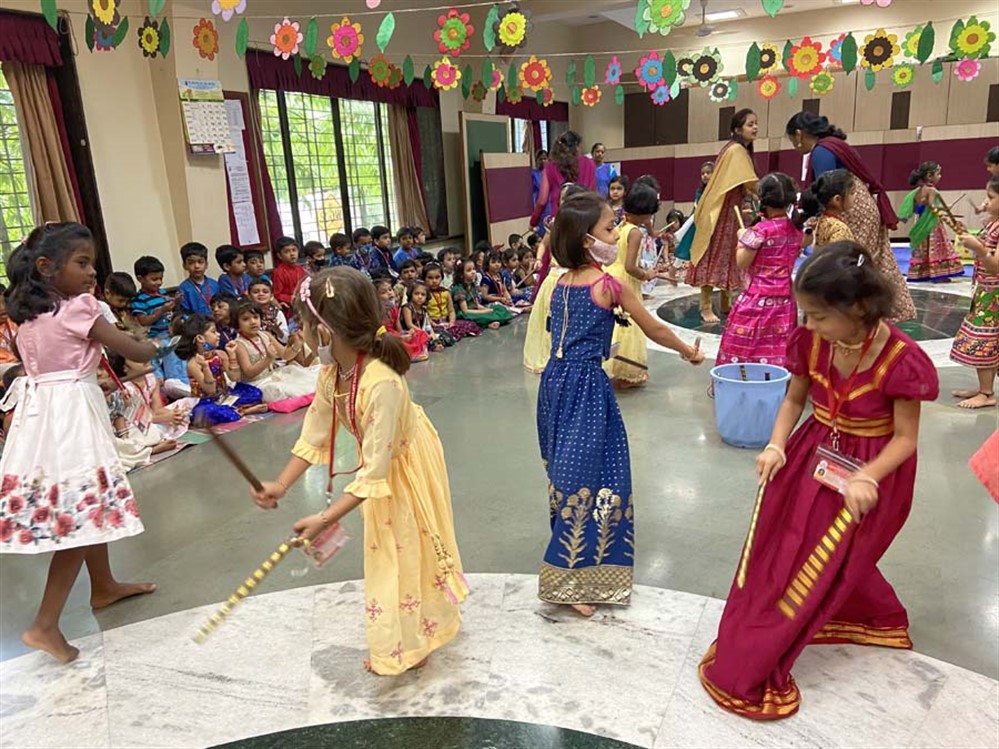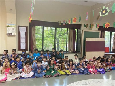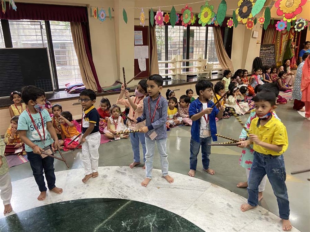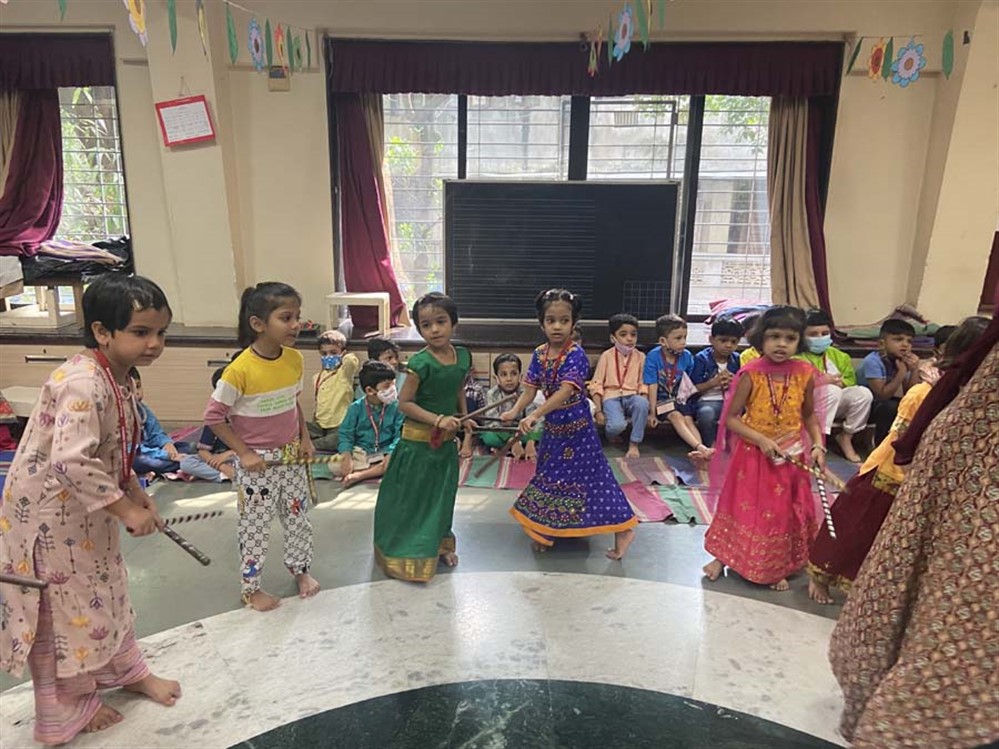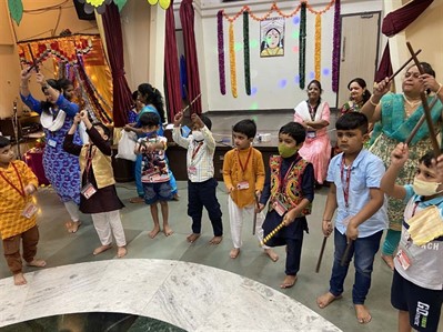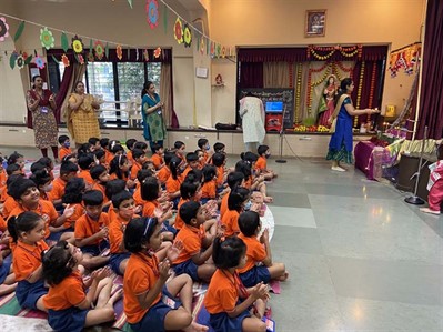 In our school an idol of Devi Durga is placed on a chaurang decorated with flowers and colourful fabrics. Every day pooja is performed with arati, jogwa and naivedya is offered to Devi. Also children perform ‘Bhondla’ and ‘Garba’ as devotional dances, wearing colourful clothes in front of Devi. This is followed by offering khirapat (secret snacks) to children. Even teachers wear nine different colours of sarees during this festival and enjoy playing Bhondla along with children.