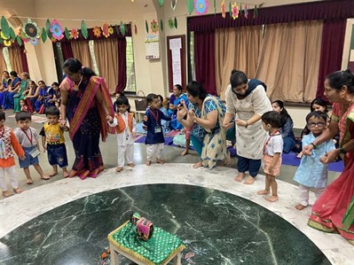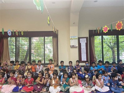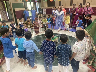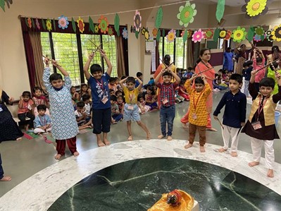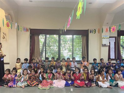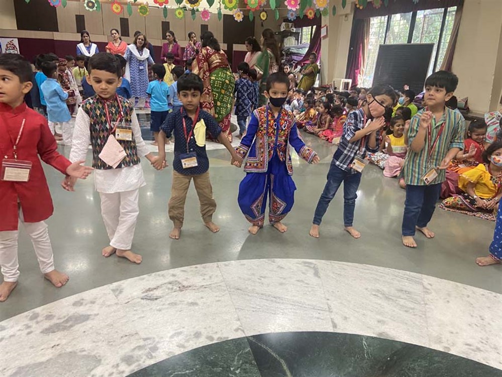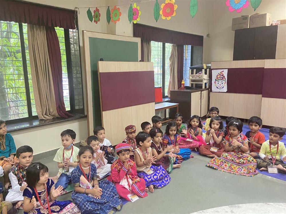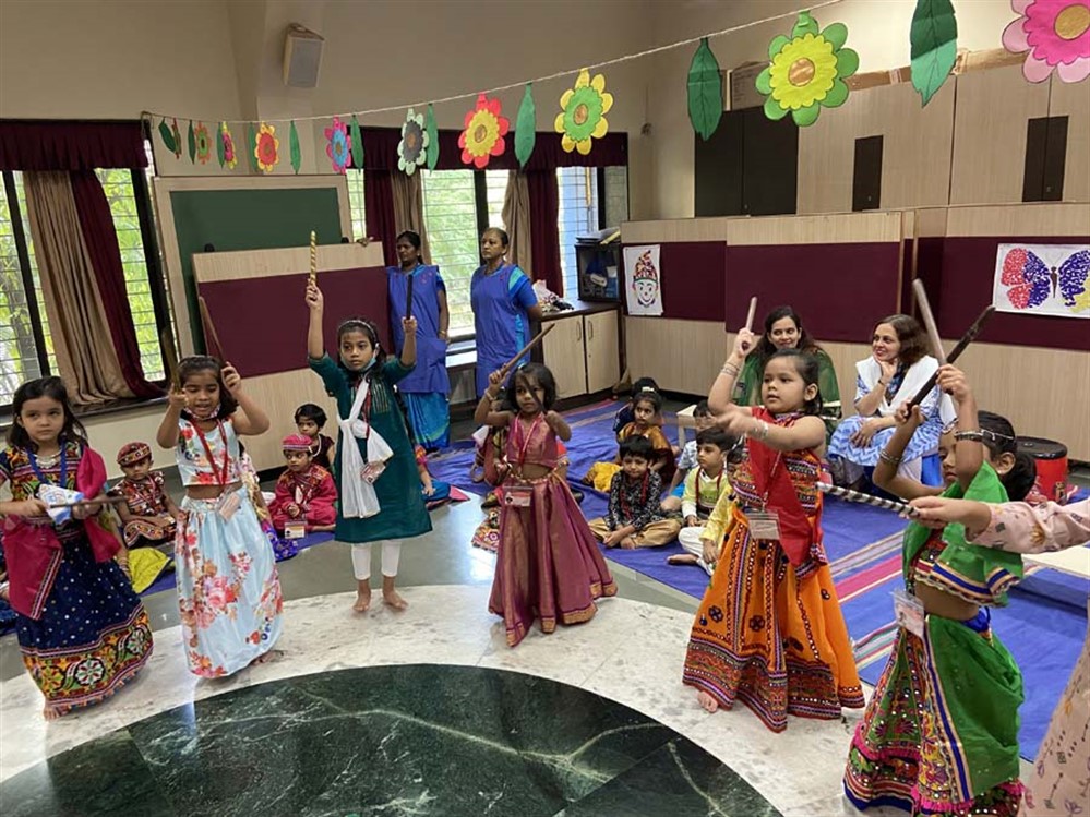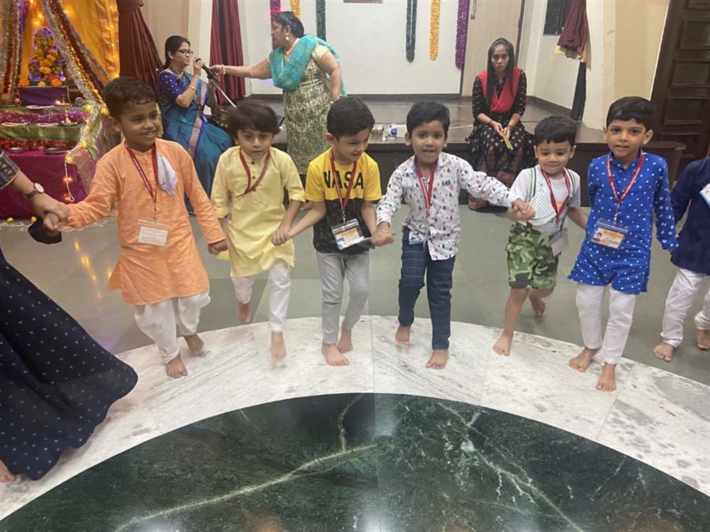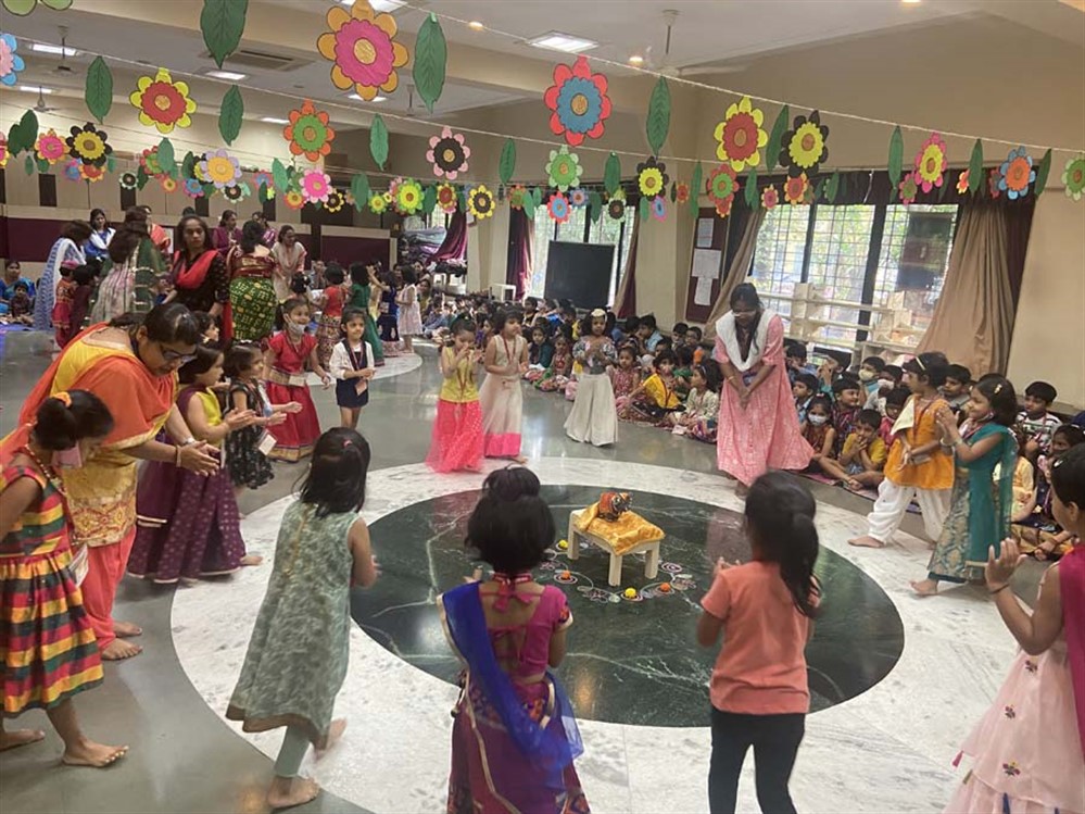 In our school an idol of Devi Durga is placed on a chaurang decorated with flowers and colourful fabrics. Every day pooja is performed with arati, jogwa and naivedya is offered to Devi. Also children perform ‘Bhondla’ and ‘Garba’ as devotional dances, wearing colourful clothes in front of Devi. This is followed by offering khirapat (secret snacks) to children. Even teachers wear nine different colours of sarees during this festival and enjoy playing Bhondla along with children.