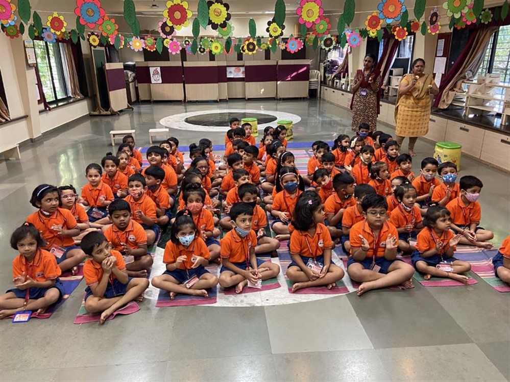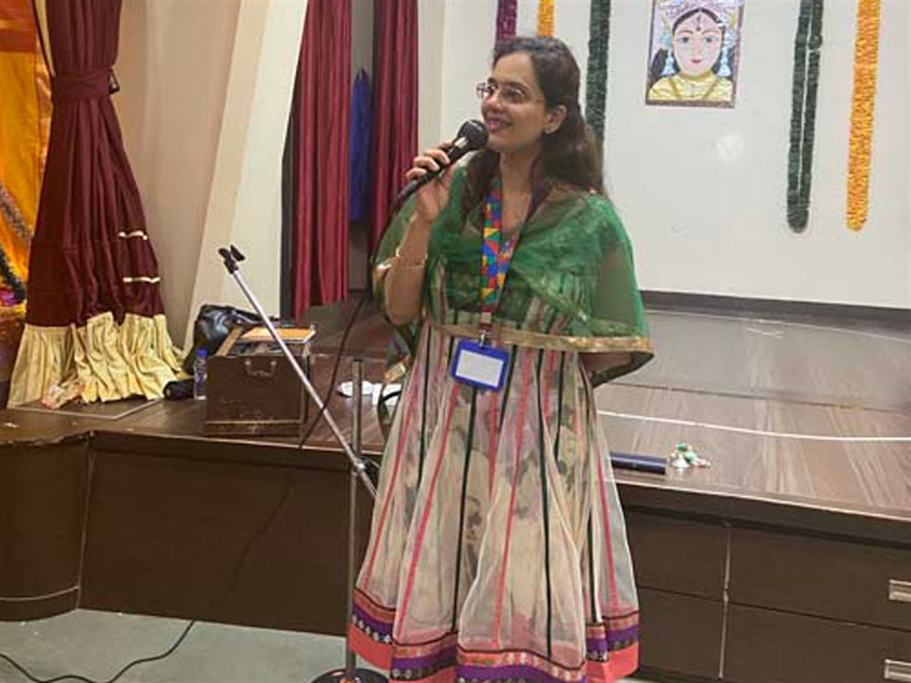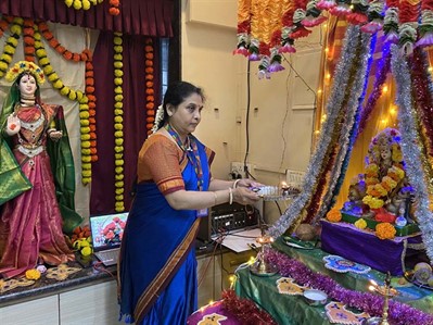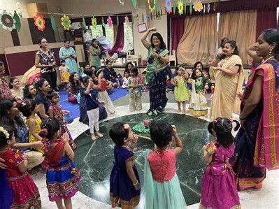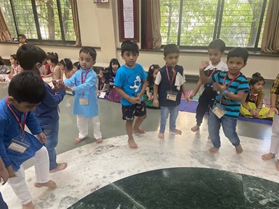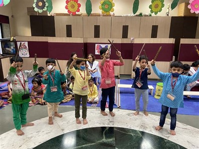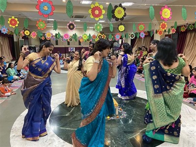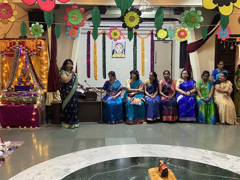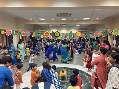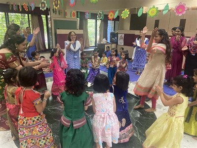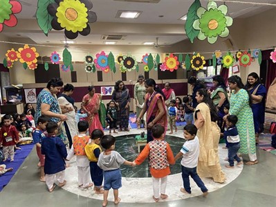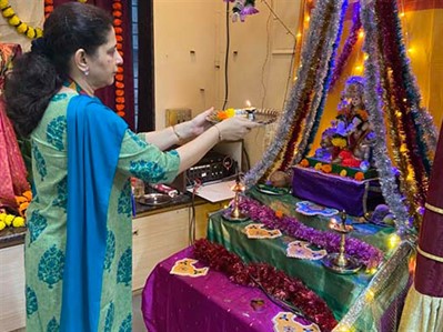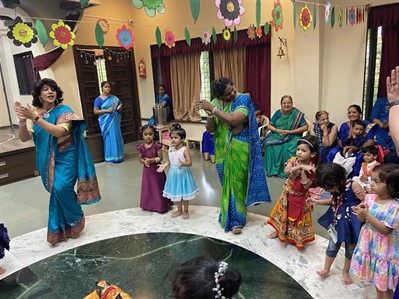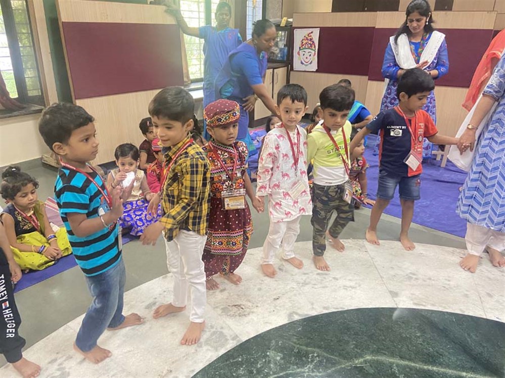 In our school an idol of Devi Durga is placed on a chaurang decorated with flowers and colourful fabrics. Every day pooja is performed with arati, jogwa and naivedya is offered to Devi. Also children perform ‘Bhondla’ and ‘Garba’ as devotional dances, wearing colourful clothes in front of Devi. This is followed by offering khirapat (secret snacks) to children. Even teachers wear nine different colours of sarees during this festival and enjoy playing Bhondla along with children.